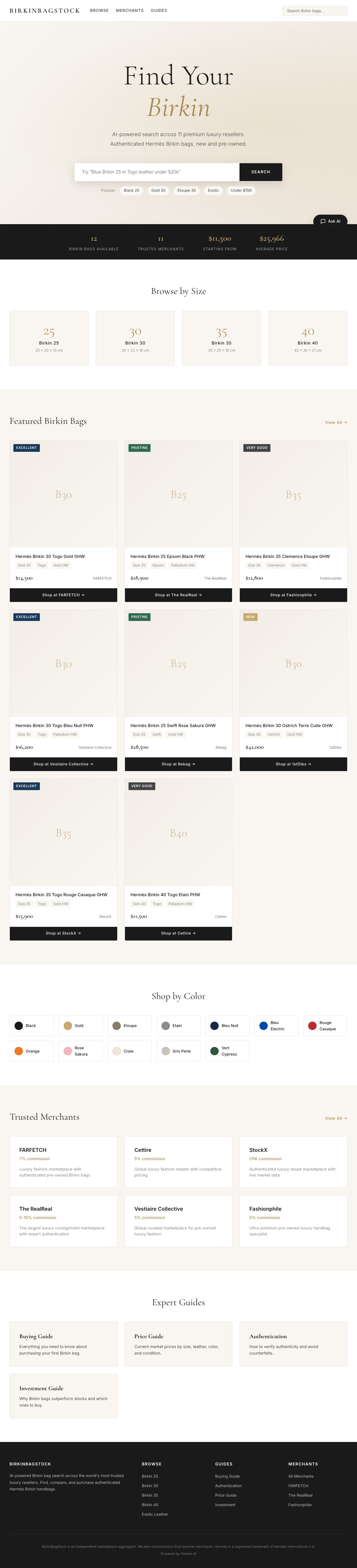 Use resale merchants with authentication processes, then compare current listings by size, color, leather, condition, photos, and included accessories. BirkinBagStock keeps the comparison layer independent so buyers can move from research to merchant checkout with more context.